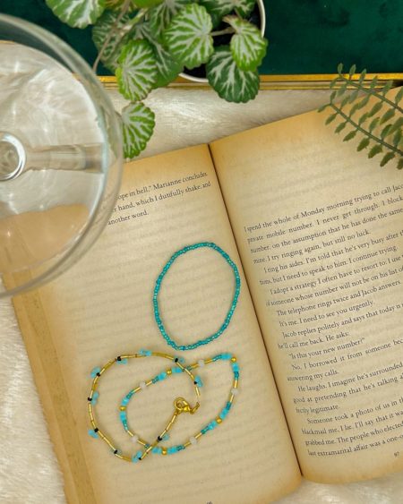 Our Bling Sky Bead Bracelet steals the show with its vibrant blue crystals, reflecting the sparkling beauty of the summer sky. And guess what? It’s not alone! The stack also features two other stunners – the pretty glass bead bracelet and the white-gold crystal bead bracelet. These handcrafted beauties are accompanied by dainty golden rings and a signature blue crystal ring.