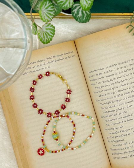 Our Fiery Star Bead Bracelet and Ring Stack is combination of pretty red daisy bracelet and bold green and red crystal bracelets accentuated with a fiery red star charm. Each piece is a unique work of art, waiting to adorn your wrist. These handcrafted beauties are accompanied by dainty golden rings and a red and golden accent ring.