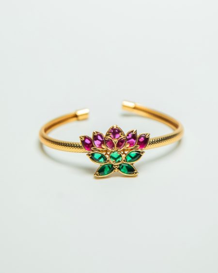 Our luxurious Aryahi bracelet features a stunning lotus design adorned with vibrant magenta and green kemp stones. Set on a classic gold-tone band, the bracelet seamlessly blends heritage craftsmanship with contemporary style. Perfect for festive occasions or everyday wear, this piece adds a touch of color and tradition to any outfit, making it an essential accessory for lovers of Indian jewelry.