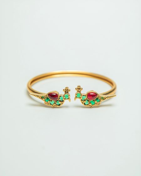Our elegant Binita bracelet features a traditional Indian design, highlighted by two intricately crafted peacock motifs facing each other. The peacocks are adorned with vibrant magenta and green kemp stones, adding a pop of color to the gold-tone finish. The fine detailing and delicate craftsmanship make this bracelet a timeless piece, perfect for adding a touch of cultural elegance to any outfit.