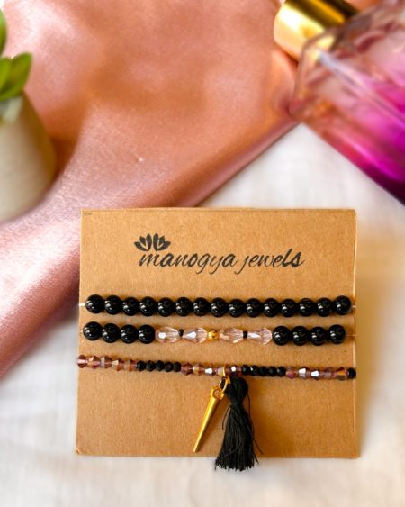 ₹1,600.00Original price was: ₹1,600.00.₹220.00Current price is: ₹220.00.Our Purple Mash bead bracelet stack is a striking fusion of black beads and regal purple crystals. Adorned with a gleaming gold charm and finished with a chic black tassel, this stack exudes sophistication and glamour. Embrace bold elegance with this stunning ensemble, perfect for making a statement with every gesture.