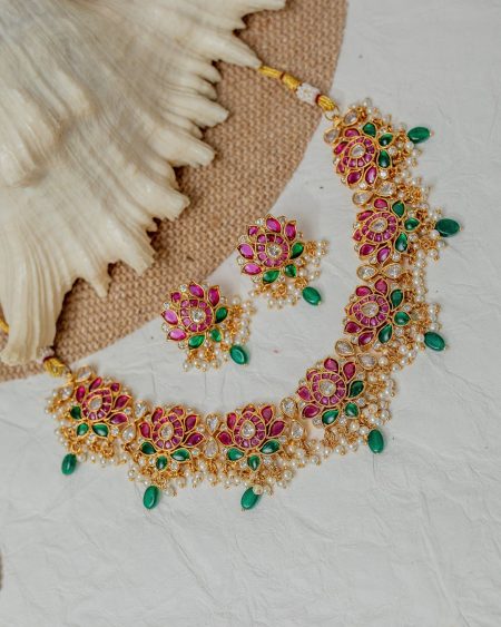 Our Aryahi necklace set is worthy of becoming your obsession. This gorgeous necklace features lotus motifs studded with vibrant magenta kemp stones that make the petals of the lotus. Deep green kemp stones are used to depict the leaves of the lotus. Sparkly white diamonds and green stone droplets add to the charm of the necklace. The lotus motif doesn’t just adorn the necklace; it extends its beauty to a pair of stunning earrings. The Aryahi Earrings, featuring vibrant pink and green lotus stud designs, mirror the opulence and elegance of the necklace.