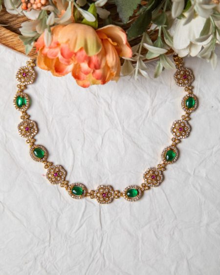 ₹4,932.00Original price was: ₹4,932.00.₹2,400.00Current price is: ₹2,400.00.Our Baanvi necklace beautifully embodies elegance and tradition. The necklace features a series of intricately designed gold-toned motifs, alternating between sparkling green stones and detailed floral patterns adorned with magenta stones and CZ accents. Each motif is meticulously crafted to create a harmonious blend of colors and textures. Perfect for adding a touch of sophistication to any outfit, this necklace is a timeless piece that celebrates the rich heritage of Indian jewelry design. The necklace is complemented by a pair of luxurious diamond-set floral stud earrings.