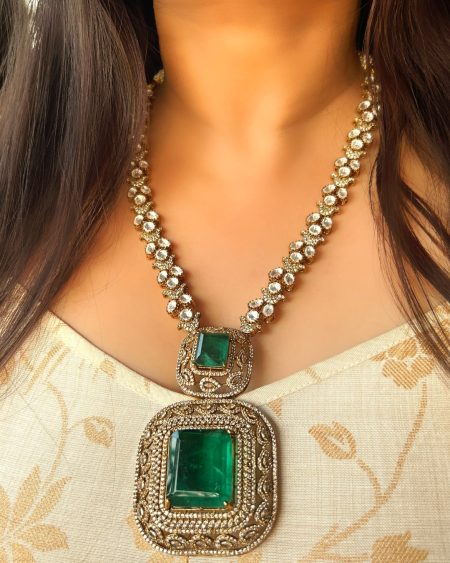 Elevate your elegance with this opulent long Polki necklace set, featuring a regal Emerald Green doublet stone at the center adorned with a frame of intricate detailing and shimmering stones. Paired with matching polki and emerald green doublet stone earrings, this timeless masterpiece exudes grandeur and sophistication, perfect for making a statement on special occasions.