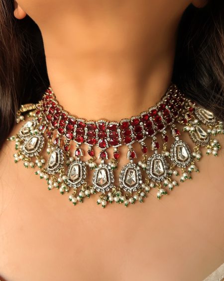 ₹35,020.00Original price was: ₹35,020.00.₹9,500.00Current price is: ₹9,500.00.Discover the epitome of elegance with our Brijnandinin Polki Choker, a timeless masterpiece for the discerning jewellery lover. This luxurious choker features emerald green stones set in an intricate pattern, exuding a regal allure. The piece is beautifully accented with sparkling Polki elements, enhancing its vintage charm. Delicate, lustrous pearls cascade gracefully, adding a touch of sophistication and opulence. Perfect for grand celebrations or a sophisticated soirée, this necklace promises to be a statement piece that embodies grace, heritage, and unrivaled craftsmanship. A must-have for those who cherish luxury and the art of fine jewellery. The necklace is accompanied by a pair of matching earrings and a maang tika.