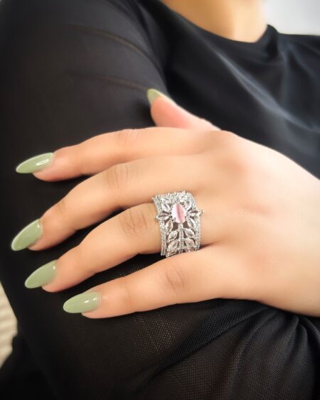 ₹950.00Original price was: ₹950.00.₹450.00Current price is: ₹450.00.Turn heads with this exquisite Soft Pink Statement Ring, a luxurious blend of vintage charm and modern elegance. Set in high-polish silver plating, the bold centerpiece features a pink oval-cut stone, framed by brilliant-cut white CZ diamonds in an intricate floral-inspired design. Perfect for weddings, evening parties, or adding a regal touch to your everyday look, this bold cocktail ring for women is a must-have for jewellery lovers who adore high-impact sparkle. Shop now and elevate your ring collection with this timeless beauty.