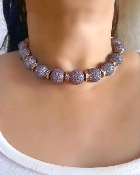 ₹19,100.00Original price was: ₹19,100.00.₹7,250.00Current price is: ₹7,250.00.A tribute to quiet opulence, our handcrafted Blush pavé choker features perfectly graduated orbs encrusted with hundreds of pink micro-crystals, each shimmering with the poise of old-money elegance and new-age glamour. The lustrous rose gold-toned separators add an architectural edge, elevating the design into an art form. Every angle of this piece reflects refinement — it’s bold, yet restrained. Glamorous, yet grounded. It doesn’t just complement an outfit; it defines it.
