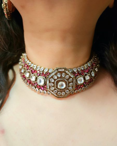 This magnificent Sadhna Kundan Choker is a necklace of dreams, radiating regal elegance and charm. The intricate design features dazzling white stones and magenta accents, set harmoniously in an antique gold finish. The octagonal central piece stands as the focal point, exuding a vintage charm. This necklace comes with a pair of statement earrings that match the octagonal central piece of the necklace. This exquisite piece is perfect for the woman who loves to make a bold, unforgettable statement.