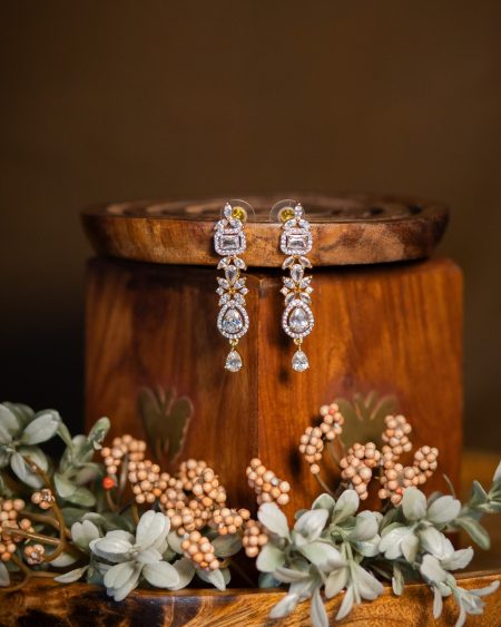 ₹8,580.00Original price was: ₹8,580.00.₹3,500.00Current price is: ₹3,500.00.Elevate your elegance with our Triveni necklace, a luxurious embodiment of sophistication and opulence. Crafted with brilliant diamonds, this luxurious gold-tone necklace features pear-shaped diamonds arranged in a leaf-like pattern along the string, with a striking rectangular diamond at the center. Luxurious diamond droplets adorn the length of the necklace, enhancing its allure. Complete with a stunning pair of long diamond earrings, the Triveni set exudes timeless luxury and refinement.