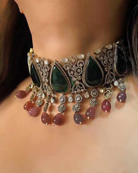 ₹25,300.00Original price was: ₹25,300.00.₹11,500.00Current price is: ₹11,500.00.Drape yourself in opulence with our exquisite Siya bridal polki necklace set, featuring rich green teardrop accents, intricate filigree, and delicate ruby-hued drop embellishments. Paired with matching polki earrings, this regal set is the epitome of timeless elegance, perfect for a bride’s grand celebration.