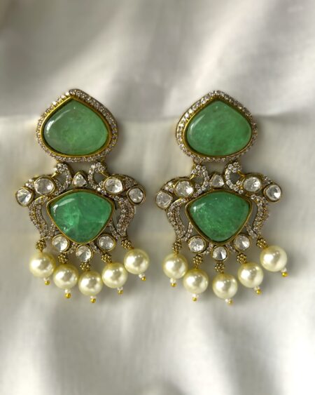 ₹6,940.00Original price was: ₹6,940.00.₹2,650.00Current price is: ₹2,650.00.Elevate your festive wardrobe with our Saisha Polki Kundan Earrings in everybody’s favourite Emerald Green shade. The earrings with its luxurious Emerald green doublet stone, antique-finish gold plating, sparkling polki kundan work and luminous faux pearl drops, is a masterpiece of intricate craftsmanship and opulence. Designed for the fashion-forward yet price-conscious shopper, this pair exudes timeless charm and royal flair, making it perfect for weddings, haldi/mehendi ceremonies, or festive brunches.