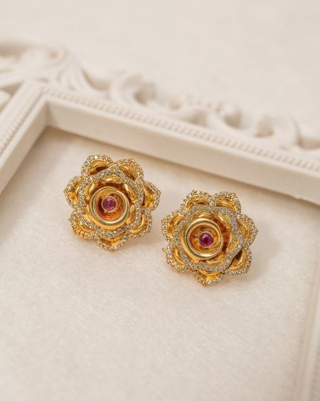 ₹2,340.00Original price was: ₹2,340.00.₹1,250.00Current price is: ₹1,250.00.Introducing our Rosalia studs, exquisitely crafted with a majestic full bloom rose design, where each petal is delicately outlined by sparkling American diamonds. These earrings boast a clip-on closure in addition to the push-back closure, providing additional support and a secure fit. At the heart of this stunning design lies a lustrous kemp stone, adding a touch of elegance and sophistication to every ensemble.
