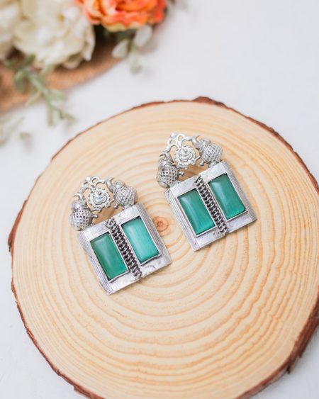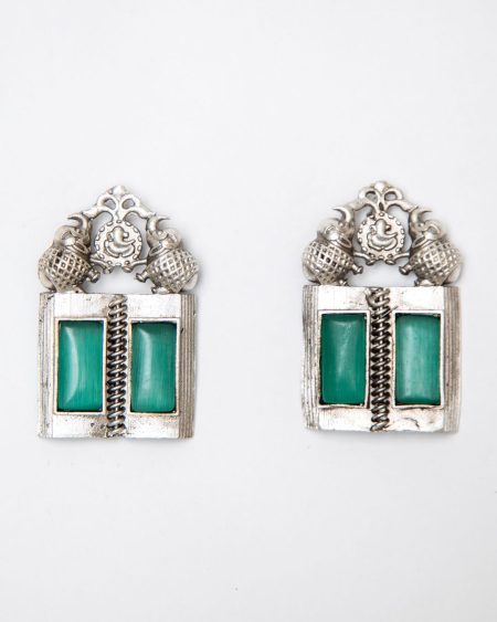 ₹2,060.00Original price was: ₹2,060.00.₹890.00Current price is: ₹890.00.Our Ela earrings, inspired by a holy book, feature a rectangular plaque with an open-book design that is adorned by two mint blue Monalisa stones with a spiral binding design in the centre, reminiscent of an open granth. The earrings boast artistically carved elephant motifs at the top with a small circle between them. The circular element showcases a majestic carving of the revered Indian god, Ganesha. Crafted with a silver lookalike finish, these earrings exude timeless charm and sophistication, making them a versatile addition to any jewelry collection.