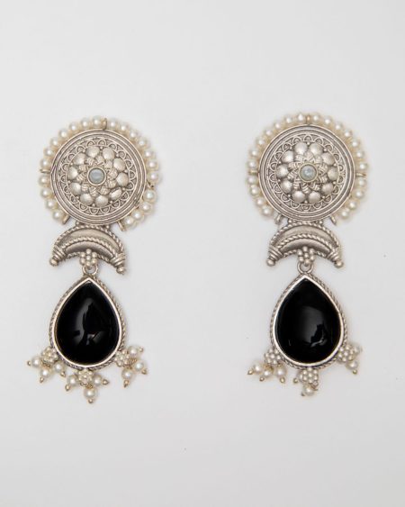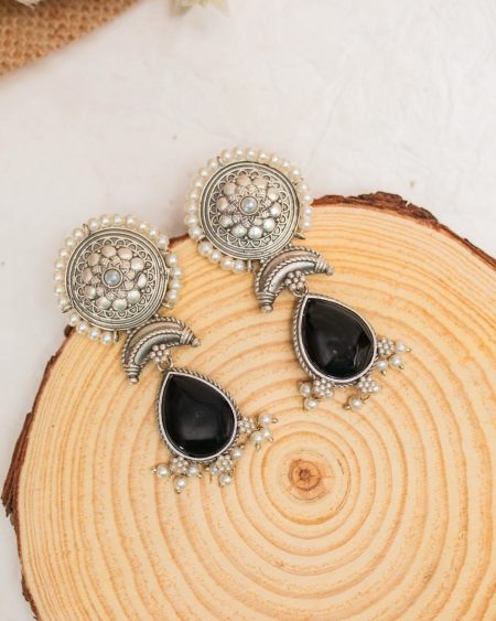 ₹2,060.00Original price was: ₹2,060.00.₹950.00Current price is: ₹950.00.Our Elnara earrings showcase a silver-hued circular stud adorned with intricate Mughal and Indian art-inspired patterns, beautifully framed by a delicate pearl border. The ornate stud gracefully transitions to a striking pear-shaped black Monalisa stone droplet, creating a stunning fusion of traditional elegance and modern sophistication.Care Instructions: