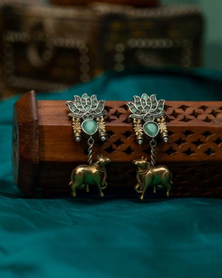 Inspired by the pichwai art, our Gomati earrings feature a beautifully carved cow motif with green bejeweled lotus stud.