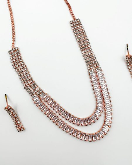 ₹800.00Original price was: ₹800.00.₹399.00Current price is: ₹399.00.Tyra is a two-tiered necklace studded with round and baguette diamonds. Rose gold finish adds vibrancy and creates a charming piece of jewellery that can be effortlessly styled for a day or a night look.