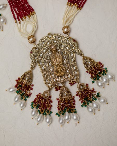 Our exquisite Venkateshwara Polki Balaji Necklace is one of those special pieces which could be valued only by true jewellery connoisseurs. The pendant with intricately carved figurine of Lord Balaji and Laxmi mata is undoubtedly the centre of attraction. The figurines are accentuated by polki kundans and diamonds. Lovely crystal and pearl droplets add to the charm of polki-studded jhumki motifs that are added to the pendant, making the entire pendant a work of art and true epitome of opulence. The necklace pendant is held together with strands of tiny pearls, and deep maroon and green crystals. The necklace is accompanied by polki jhumkas. The pendant and jhumkas feature a gorgeous victorian gold finish that subtly suggests grandeur.