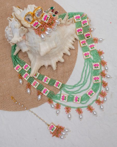 ₹8,180.00Original price was: ₹8,180.00.₹2,699.00Current price is: ₹2,699.00.Unnati is a uniquely designed necklace made with multiple layers of sea green crystal beads that come together to form a very popular Indian necklace style called the Rani Haar. As the name suggests, the necklace is fit for ladies who have a bold and distinctive personality like a Queen. Small lotus motifs, created using the art of meenakari, are woven between the crystal layer, to add a touch of pink hue while the pristine white pearl droplets add a touch of sophistication, all culminating into a gorgeous ornament. The necklace is accompanied by a pair of matching earrings featuring a lustrous polki stud with the meenakari lotus pendant and long crystal droplets. The Set is complete with an aesthetic maang tika that mimics the design of the earrings.