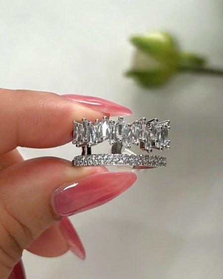 ₹2,400.00Original price was: ₹2,400.00.₹1,250.00Current price is: ₹1,250.00.Add an instant dash of drama and elegance to your look with our ZigZag Crystal Baguette Dual-Band Ring – a refined blend of sparkle, structure, and affordability. Featuring a striking upper band adorned with vertically set baguette-cut CZ stones and a complementary micro-pavé lower band, this silver-finish ring delivers the appearance of fine jewellery at a fraction of the cost. Whether worn as a standalone piece or paired with your everyday stackables, this high-shine ring is perfect for weddings, brunches, office glam, and more. Designed for the woman who values fashion, quality, and budget, it offers luxury vibes without the luxury price tag.