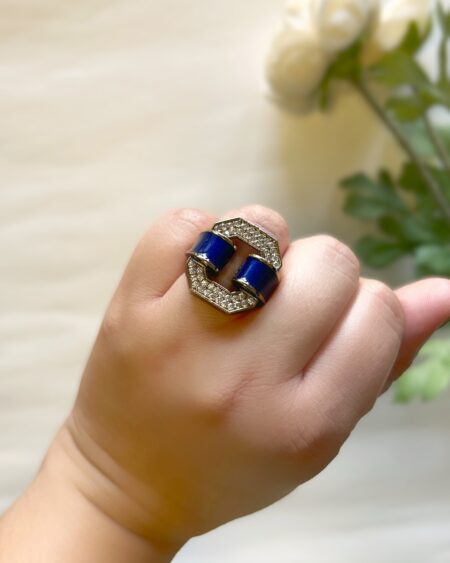 ₹3,280.00Original price was: ₹3,280.00.₹1,190.00Current price is: ₹1,190.00.Unapologetically bold and undeniably chic — our Adriana Geometric Blue Enamel Cocktail Ring is a masterstroke in contemporary glamour. Sculpted in an avant-garde octagonal form, its deep cerulean enamel bands are dramatically offset by pavé-set brilliance, capturing the light — and attention — from every angle. A haute couture-inspired piece that whispers sophistication while shouting style, it’s your ultimate after-dark essential or power-luxe day accent. Slip it on and let your hands do the talking.