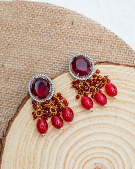 Our Raavi Necklace is a bold statement piece that demands attention with its enchanting deep red hue, destined to steal the spotlight wherever you go. This stunning necklace is adorned with bold deep red diamond stones and red crystal and bead droplets. Pairing seamlessly with the necklace are the matching red stone earrings, exuding the same commanding aura.