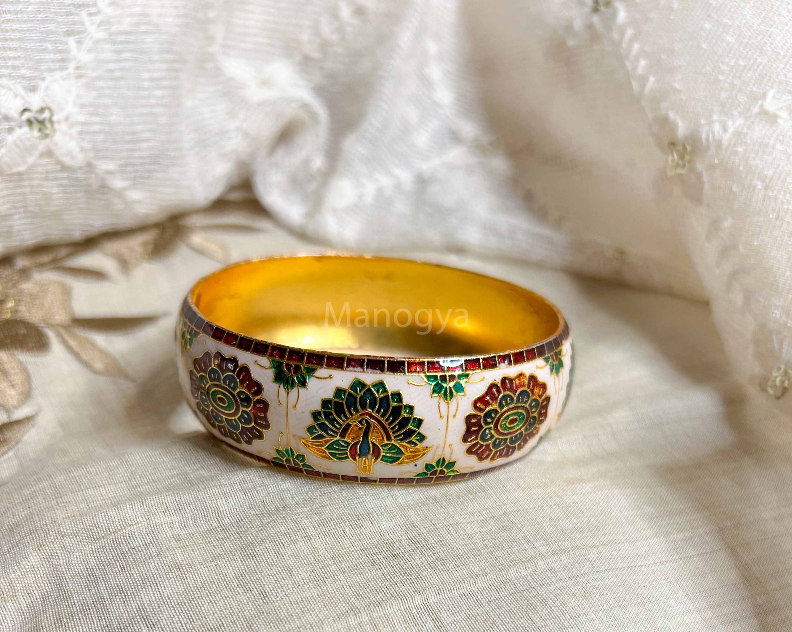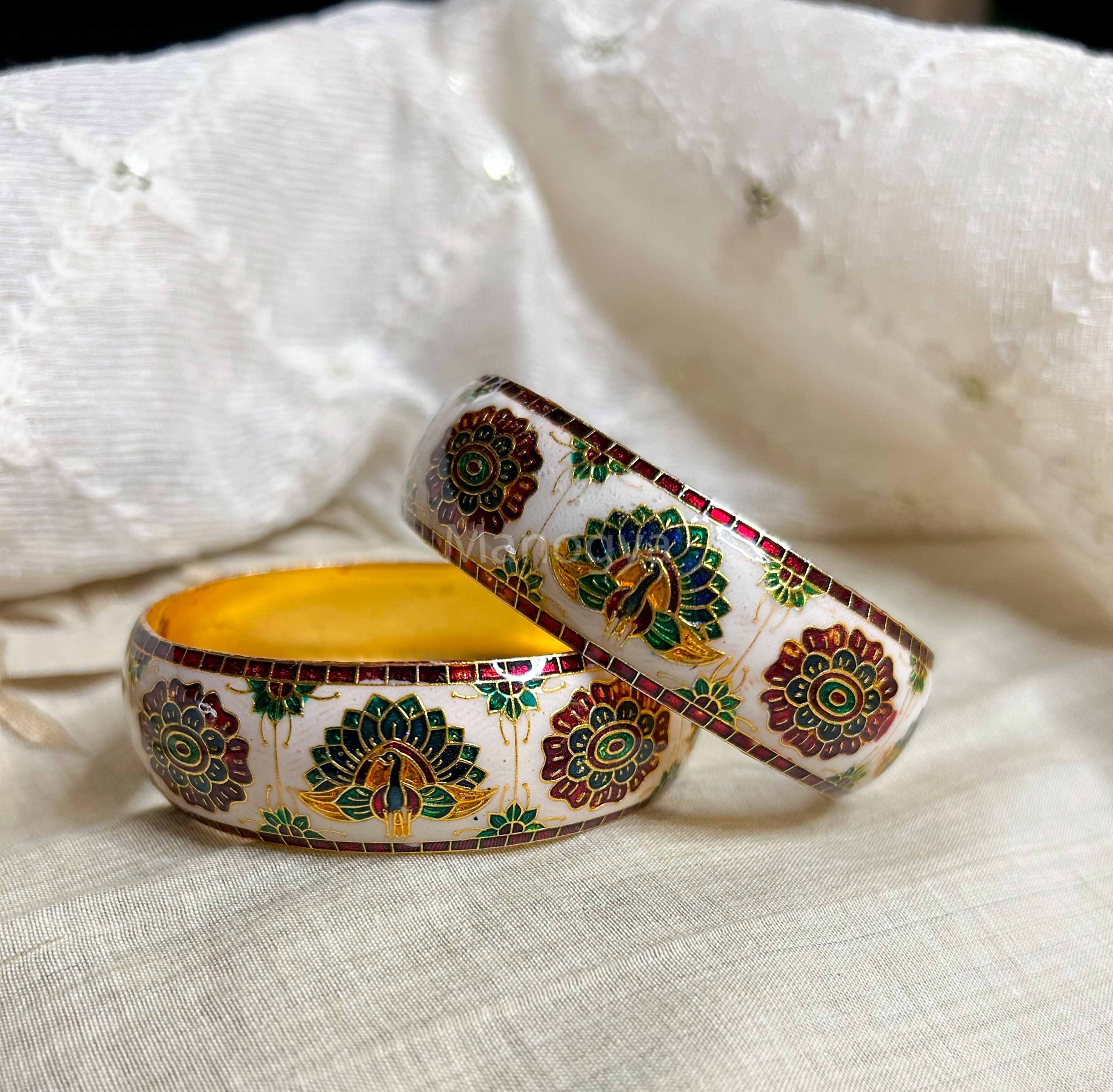 This pair of handpainted meenakari kadas features colourful peacock and flower motifs that exude the romantic “Saawan” vibe.