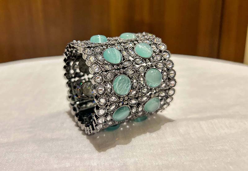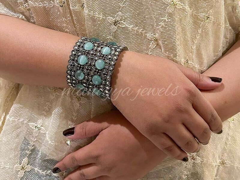 Somethings are simply beautiful and such is our Sharon bracelet. This gorgeous victorian black-polished bracelet is studded with diamonds and accentuated with seagreen hydro stones.