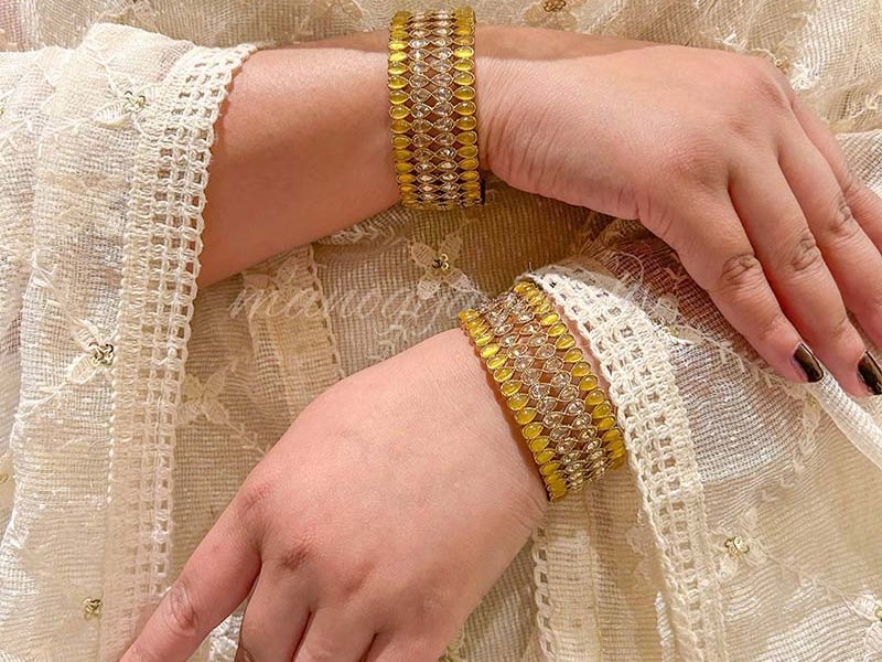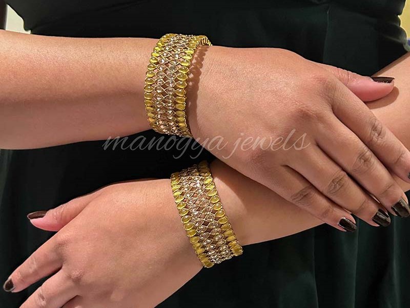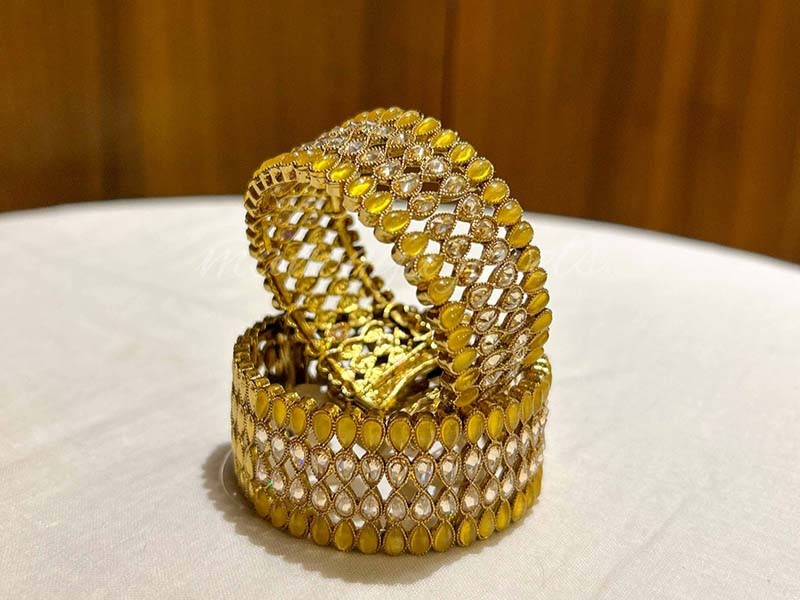 Our Tarini bracelet comes with Champagne-coloured diamonds paved in the middle. The diamonds are set in reverse settings and sparkle like stars. They are accompanied by yellow hydro stones that outline the bracelet.