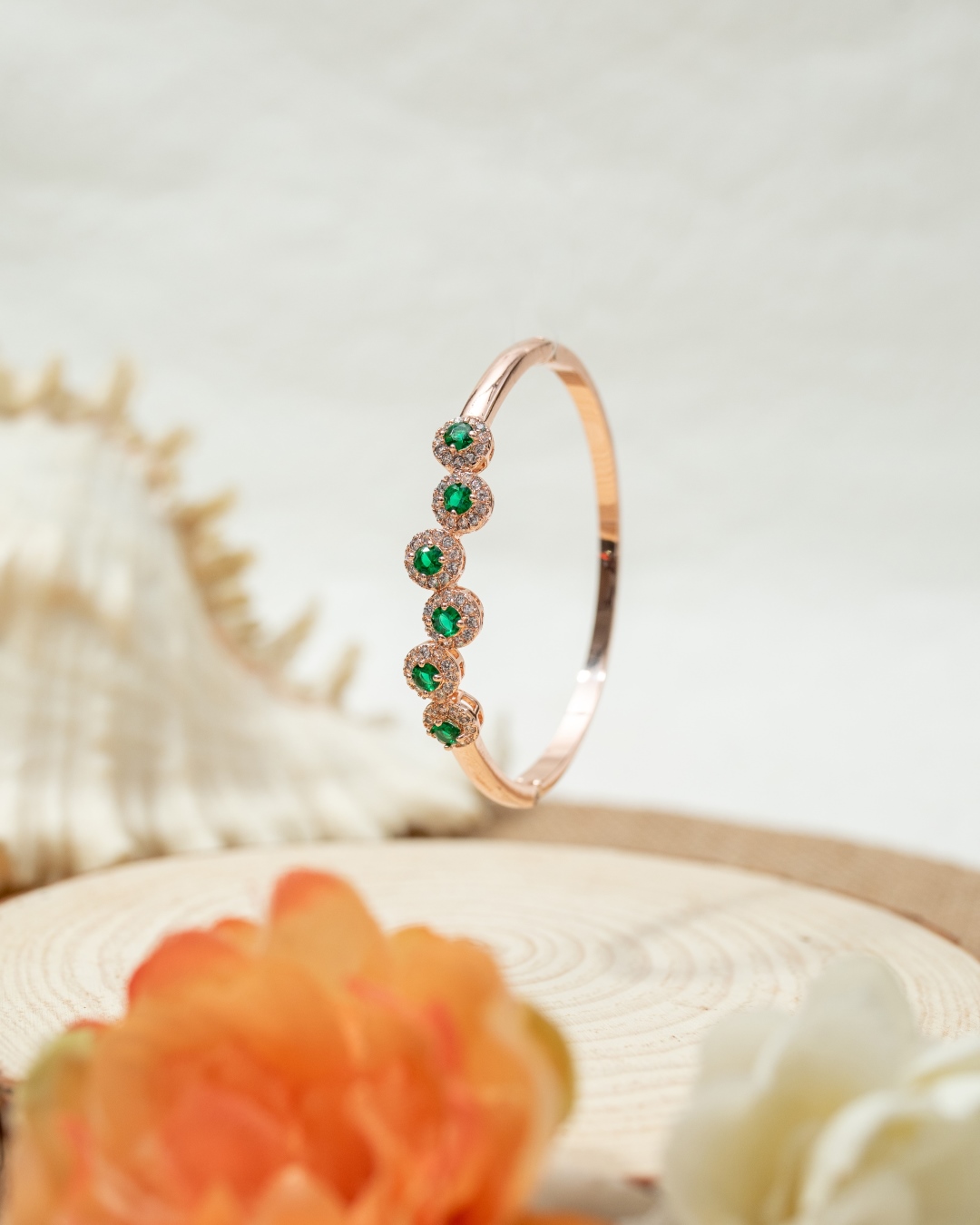 Our Tracy bracelet boasts six delicate circles, each adorned with a captivating emerald green stone at its heart. Each of the green stones feature a radiant halo of glistening white diamonds. It is a versatile piece that could be paired with a multitude of hand jewellery, both traditional and contemporary.