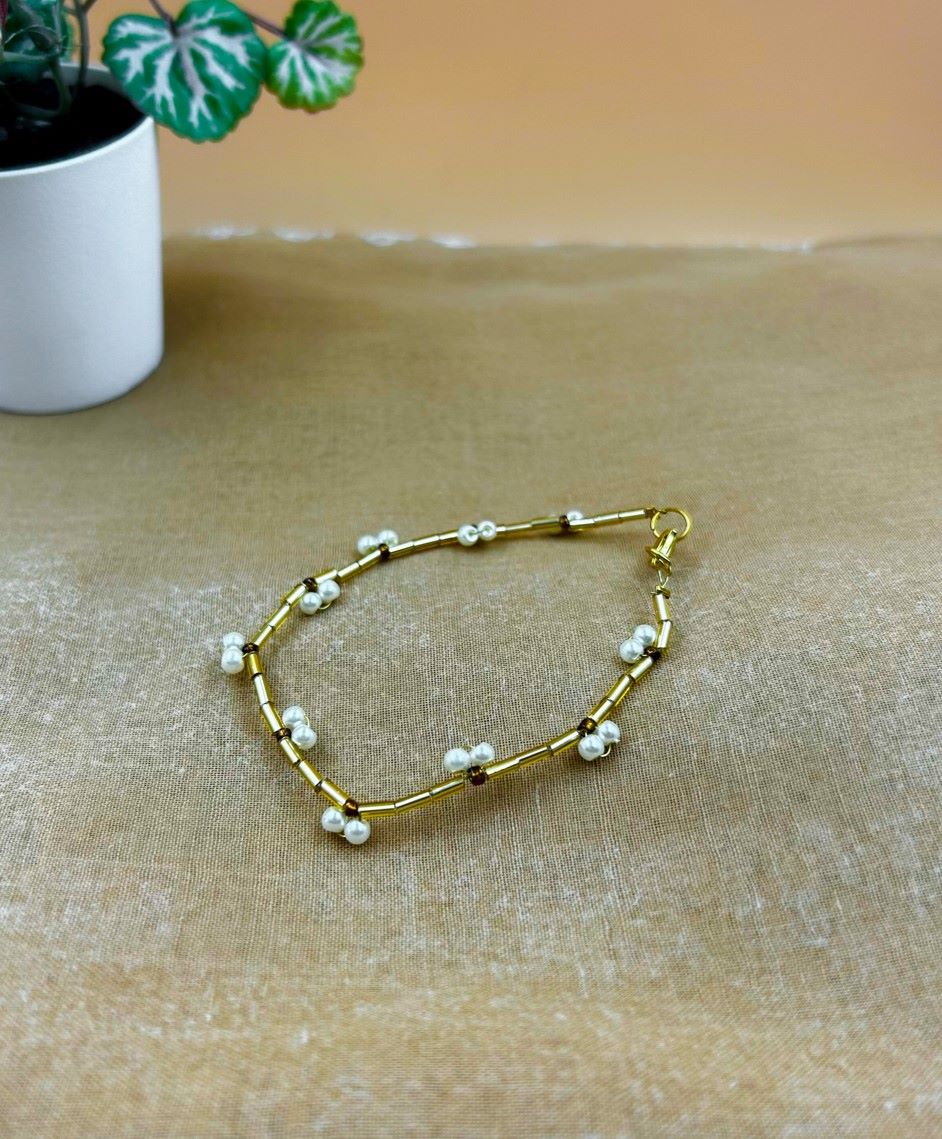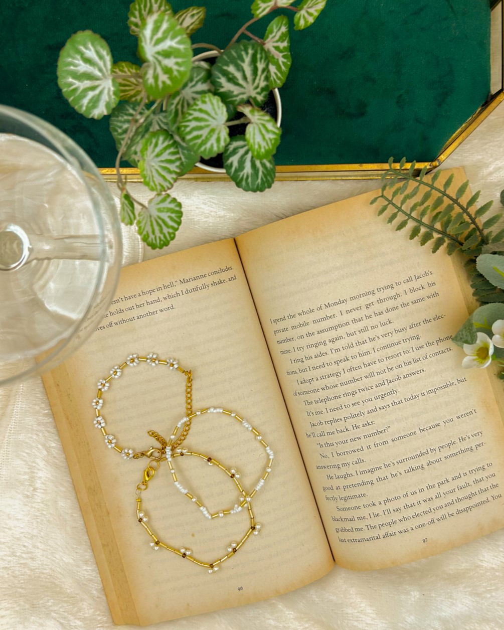 Complementing the daisy bracelet are two stunning bead bracelets. The first features pretty pearls, symbolizing purity and elegance, while the second showcases white-gold crystal beads that radiate with brilliance and sophistication. Together, these bracelets create a mesmerizing symphony of colors and textures that captivate the senses.