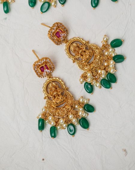 One from our premium temple jewellery collection, this gorgeous piece is one that you will definitely fall in love with. The necklace features intricately carved Goddess Laxmi figurines that hang from a beautiful diamond and ruby stone studded necklace. The emerald green stone droplets added to the Laxmi pendants harmoniously blends with the overall look of the necklace, giving it the much-needed depth and traditional charm. The necklace is accompanied by intricately carved Laxmi earrings.