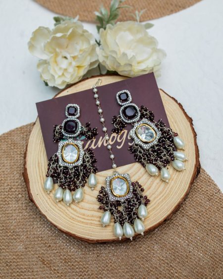 You’ll be left spellbound by this gorgeous polki diamond necklace set that features luxurious and unique wine-coloured cushion-cut diamond necklace made opulent with a ravishing polki pendant and several clusters of wine-shade crystal droplets. White pearl drops at the ends of the crystal droplets, makes this necklace look graceful and luxurious. Like the necklace, the earrings also feature wine-hued cushion-cut diamonds at the top with long polki droplet that’s further accentuated with crystals and pearls. The necklace comes with a matching maang tika that completes the set, making it a complete bridal set.