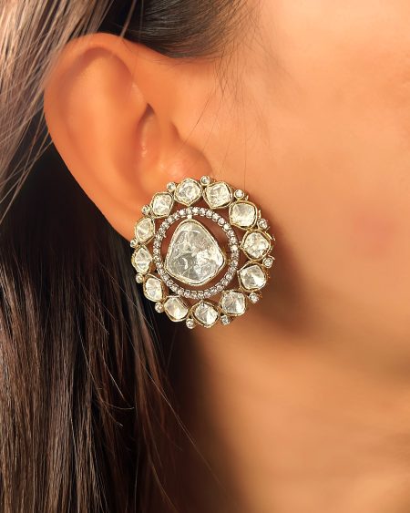 Simple yet gorgeous, our Saya polki necklace exudes elegance and royalty. It features a double layer of polki stones and comes with a pair of beautiful polki earrings. It’s a must-have for this wedding season.
