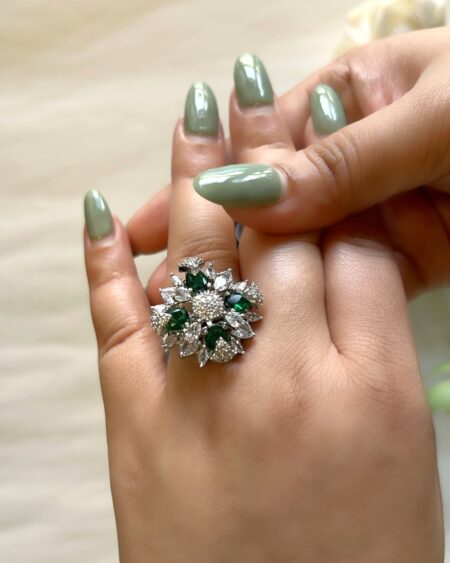 A vision of contemporary regality, this exquisite Alishba choker brings together the serene elegance of deep emerald beads, the timeless allure of lustrous pearls, and the brilliance of precision-cut CZ diamonds. At the centre lies a majestic silver medallion—an intricately detailed masterpiece set with a vivid green stone, surrounded by dazzling concentric halos that shimmer with sophistication. Designed for elegance and sophistication, this choker set comes with matching stud earrings that mirror the intricate pendant design Each element is flawlessly balanced to create a necklace that feels both modern and majestic, effortlessly elevating bridal ensembles and festive couture. Crafted for women who embrace understated opulence, this piece is more than adornment—it’s a refined statement of prestige and poise.