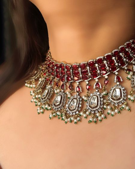 Often at crossroads whether to go all out and wear a dazzling heavy jewellery or go minimalist? Try our Kalpana necklace set that features an intricately designed oxidised pendant, studded with vibrant diamonds that encircle a maroon stone. This exquisite pendant sits atop a cluster of five crystal bead strings, all coming together to make an elegant choker necklace. The neckpiece is complimented by a pair of vibrant diamond studs.