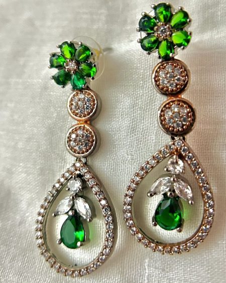 Our Piya necklace is an elegant piece of jewellery for those who prefer some a more minimal style. It features a combination of Rosegold and Victorian black diamond circles arranged in an alternating pattern, with a emerald green floral diamond pendant in the center. The necklace comes with a pair of matching earrings.