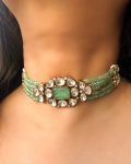 Make a statement of grandeur with this regal Mahtab emerald-green choker necklace. Embellished with radiant polki kundans and emerald green stones, intricate floral designs, and elegant pearl drops, it exudes sophistication and luxury. A pair of matching earrings with emerald green drops enhances the beauty of this extravagant creation. Perfect for weddings and gala evenings, this masterpiece is crafted to captivate and inspire awe.