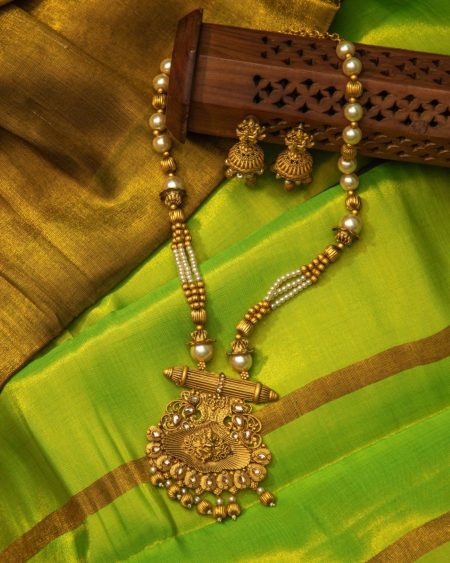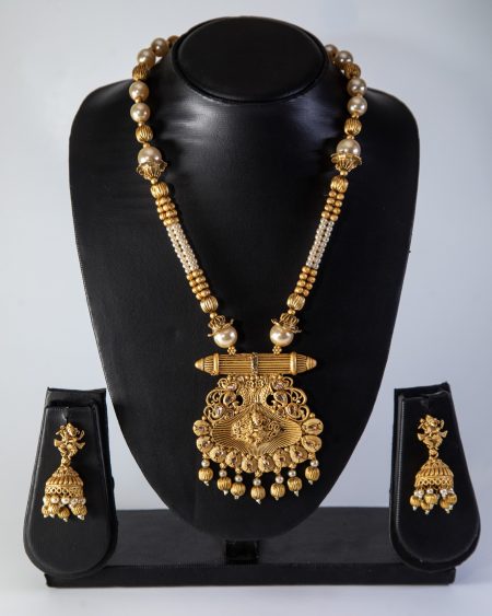 This beautiful golden-hued necklace features intricately carved goddess motif with white pearl detailing and matching earrings.