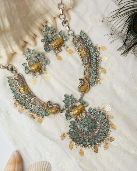 Shraddha is a Premium Silver Lookalike Hasli crafted from brass. This dual-tone piece is engraved with delicate trellis and peacock motifs and studded with light blue Jaipuri stones and comes with a pair of matching earrings.