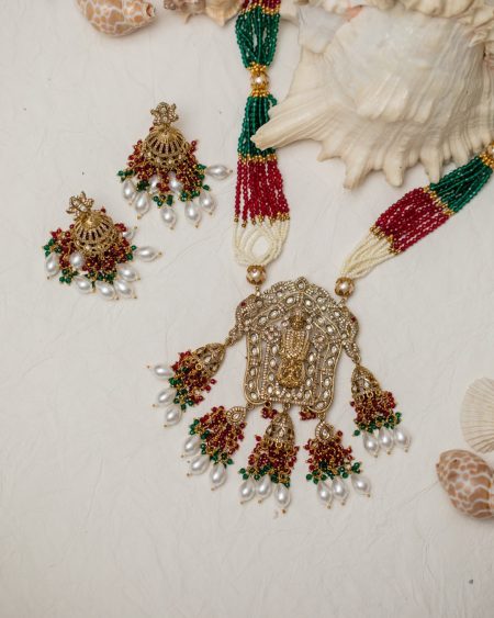 Our exquisite Venkateshwara Polki Balaji Necklace is one of those special pieces which could be valued only by true jewellery connoisseurs. The pendant with intricately carved figurine of Lord Balaji and Laxmi mata is undoubtedly the centre of attraction. The figurines are accentuated by polki kundans and diamonds. Lovely crystal and pearl droplets add to the charm of polki-studded jhumki motifs that are added to the pendant, making the entire pendant a work of art and true epitome of opulence. The necklace pendant is held together with strands of tiny pearls, and deep maroon and green crystals. The necklace is accompanied by polki jhumkas. The pendant and jhumkas feature a gorgeous victorian gold finish that subtly suggests grandeur.