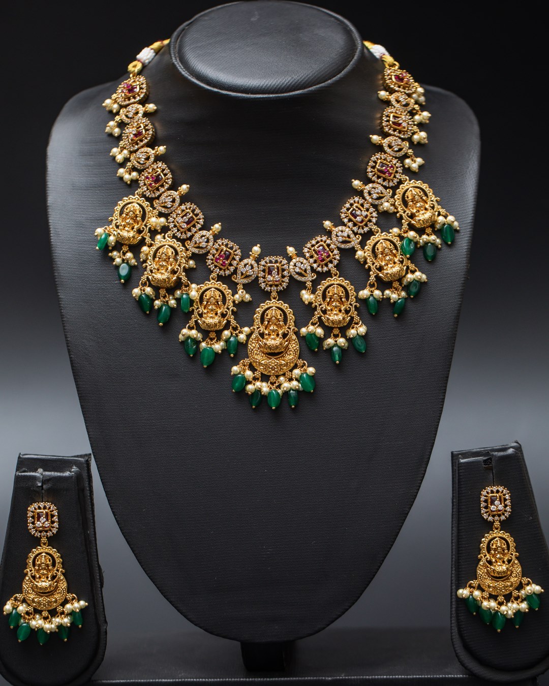 Enhancing the allure of the necklace are the emerald green stone droplets that harmoniously blend with the overall design, creating a sense of depth and dimension that’s sure to make you stand out and leave a lasting impression wherever you go. These droplets are more than just accents; they are a reflection of the intricate craftsmanship and exquisite design that elevates the necklace to the realm of art, making it a true testament to the rich cultural heritage and traditional charm that’s sure to captivate the hearts of all those who appreciate true beauty.