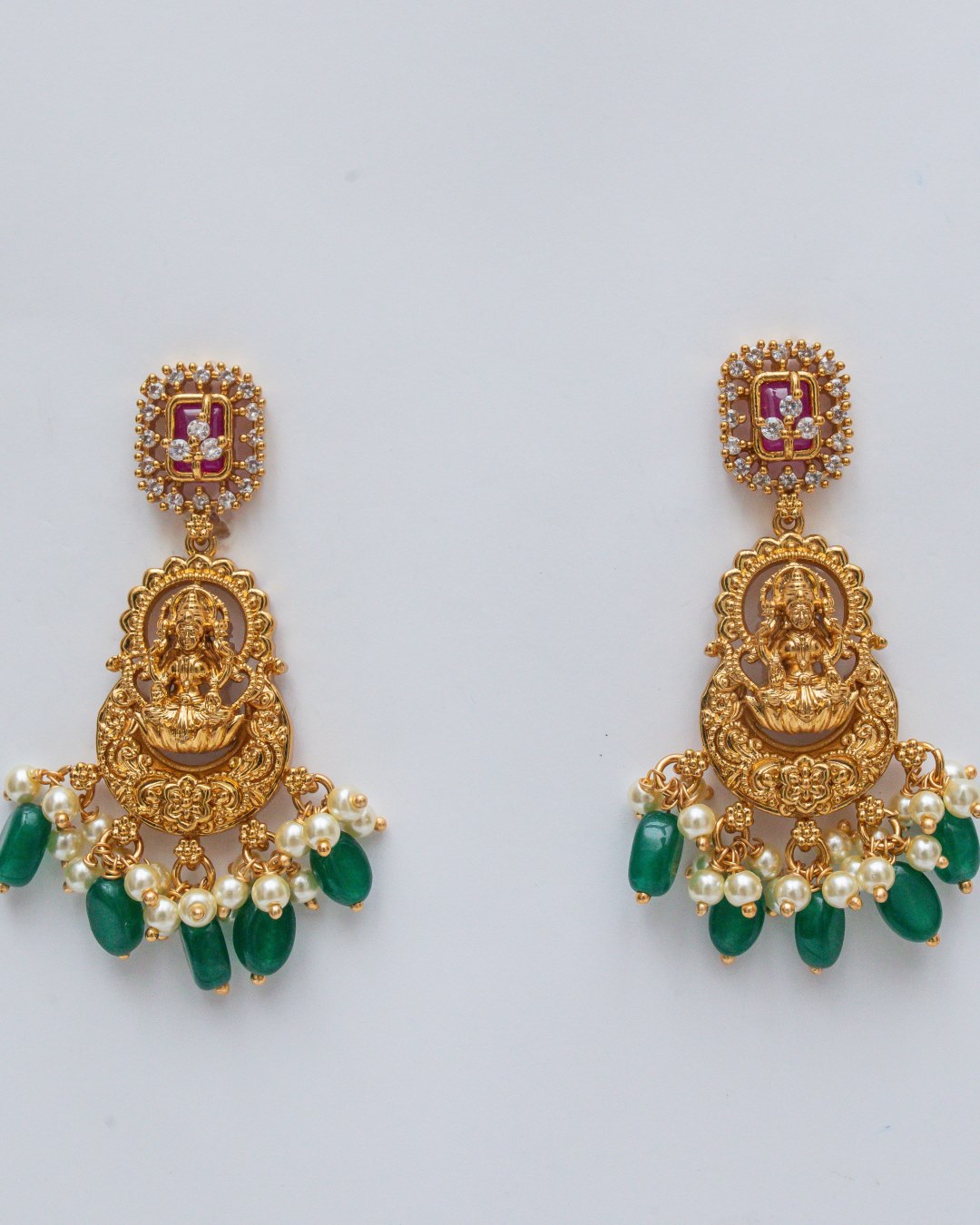One from our premium temple jewellery collection, this gorgeous piece is one that you will definitely fall in love with. The necklace features intricately carved Goddess Laxmi figurines that hang from a beautiful diamond and ruby stone studded necklace. The emerald green stone droplets added to the Laxmi pendants harmoniously blends with the overall look of the necklace, giving it the much-needed depth and traditional charm. The necklace is accompanied by intricately carved Laxmi earrings.
