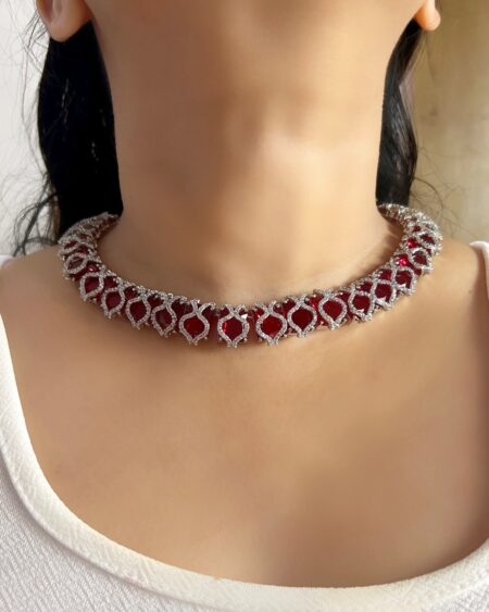 Gorgeous deep maroon carved stones, golden hues and bright and shiny CZs are all the elements that have come together to create this perfect piece of jewellery that is just fit for any occasion, be it a wedding function, Indian festivals or just a day when you wish to adorn a nice traditional Indian outfit.