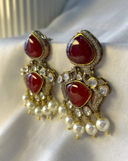 Make a stunning statement with our Saisha Maroon Kundan Pearl Earrings — a perfect blend of royal elegance and modern charm. Featuring rich ruby-red glass stones set in traditional polki kundan craftsmanship, these earrings are beautifully accentuated with sparkling CZ stones and finished with classic pearl danglings. Crafted for women who appreciate luxury, this design is ideal for wedding functions, festive celebrations, or even an intimate cocktail night. The bold red tones flatter all Indian skin tones and elevate both ethnic and Indo-western outfits effortlessly.