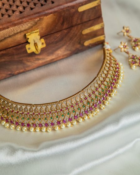 Gorgeous deep maroon carved stones, golden hues and bright and shiny CZs are all the elements that have come together to create this perfect piece of jewellery that is just fit for any occasion, be it a wedding function, Indian festivals or just a day when you wish to adorn a nice traditional Indian outfit.