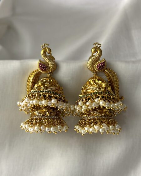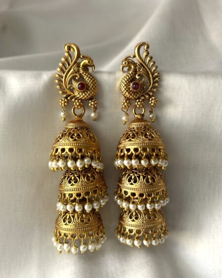 Channel timeless elegance with our Mayura Triple Jhumka Earrings, a stunning blend of tradition and craftsmanship. Adorned with intricately carved peacocks perched gracefully atop each earring, this design features two layers of antique gold-finish jhumkas cascading with delicate pearl detailing — an ode to India’s regal heritage. Perfect for weddings, temple occasions, or festive soirées, these earrings are a go-to choice for fashion-conscious women who love unique, high-quality jewellery.