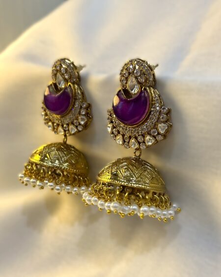 Elevate your festive wardrobe with our Gulnaaz Polki Jhumkas – a timeless luxurious piece designed to captivate. Featuring a rich purple crescent-shaped doublet stone framed by hand-set polki-style kundan stones, these heirloom-worthy statement earrings cascade into intricately carved antique gold jhumkas, finished with a playful fringe of pearl droplets. Lightweight yet impactful, these earrings are perfect for weddings, pujas, festive occasions, or even to glam up a simple kurta set. The blend of regal color, traditional craftsmanship, and fine detailing makes them a must-have jhumkas for women who value both style and substance.