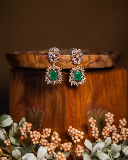 Nauheed is a stunning jewelry piece, showcasing an intricate setting of marquise diamonds that radiate elegance and sophistication. The necklace’s allure is heightened by its beautiful copper tone finish, accentuating the intricate details. The centerpiece pendant, adorned with an emerald green stone, adds a touch of luxury and opulence. Complete with a pair of matching green Diamond drop earrings, Nauheed is the epitome of refined beauty and timeless charm.