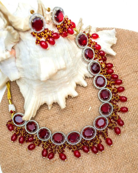 Our Raavi Necklace is a bold statement piece that demands attention with its enchanting deep red hue, destined to steal the spotlight wherever you go. This stunning necklace is adorned with bold deep red diamond stones and red crystal and bead droplets. Pairing seamlessly with the necklace are the matching red stone earrings, exuding the same commanding aura.