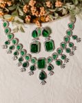 Experience the epitome of luxury and craftsmanship with our Minisha necklace. This exquisite piece showcases a brilliant diamond setting, meticulously crafted with emerald, marquise, and pear-shaped diamonds and stones. Luxurious diamond droplets along the length of the necklace enhance its allure, creating a breathtaking jewelry marvel. Complete with a stunning pair of long emerald green diamond earrings, the Minisha set exudes sophistication and elegance, perfect for making a statement at any occasion.